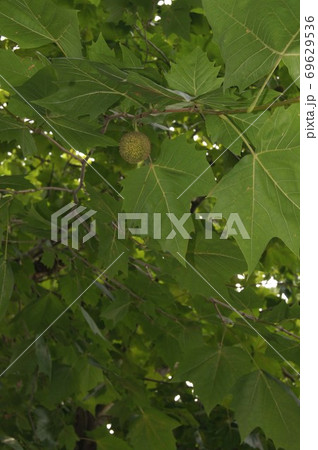 プラタナスの大きい葉と若い実の写真素材